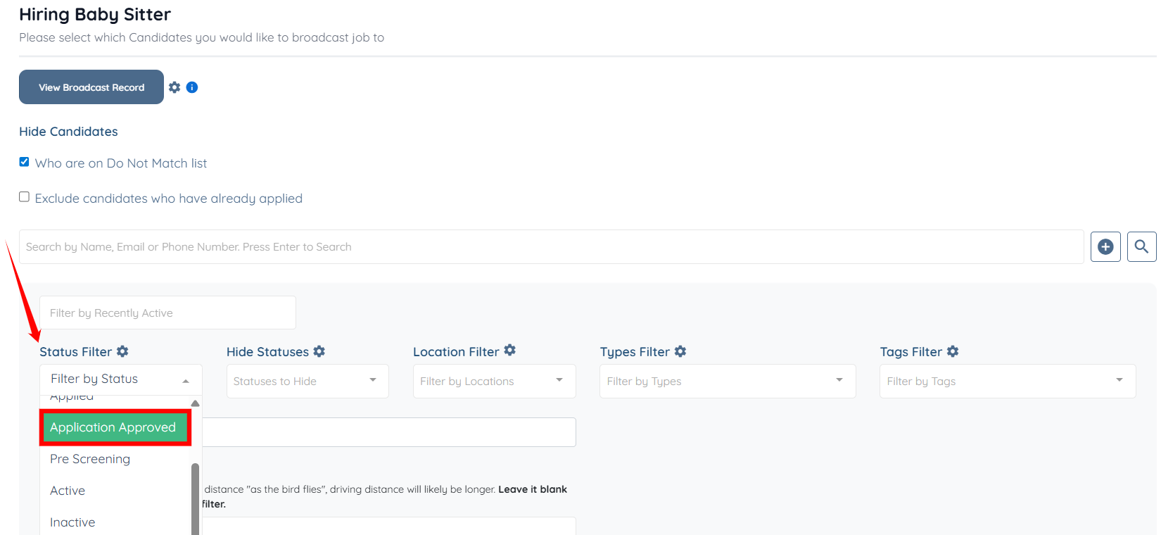 Step 3: Use the search and filter tools to narrow down the candidates you want to target when broadcasting the selected job.