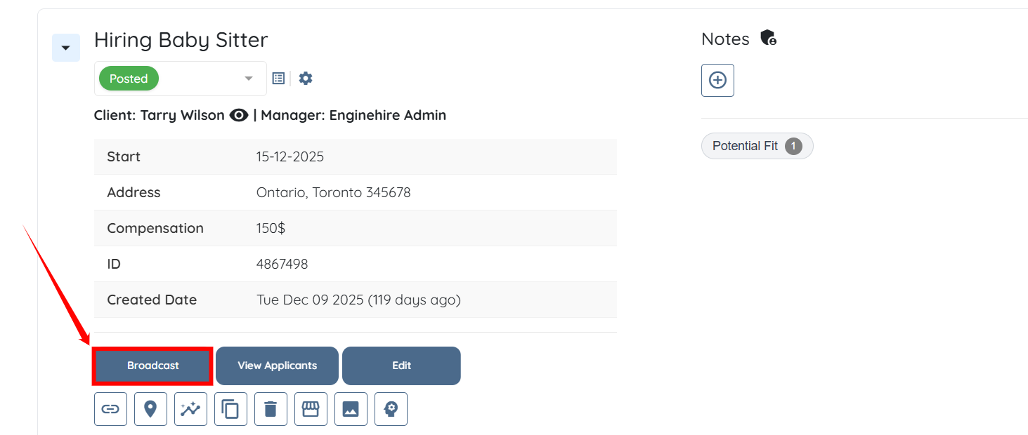 Step 2: Scroll down to the job you want to broadcast, then click the Broadcast button located just below the job, as shown in the screenshot below.