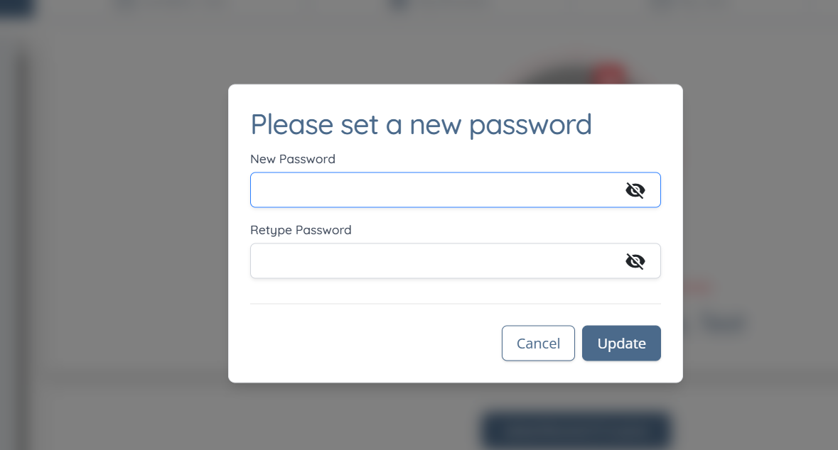 Once they log in, they will be able to change their password. A pop-up should appear on their first time logging in: Here they can enter a new password, retype it, and click update to save.
