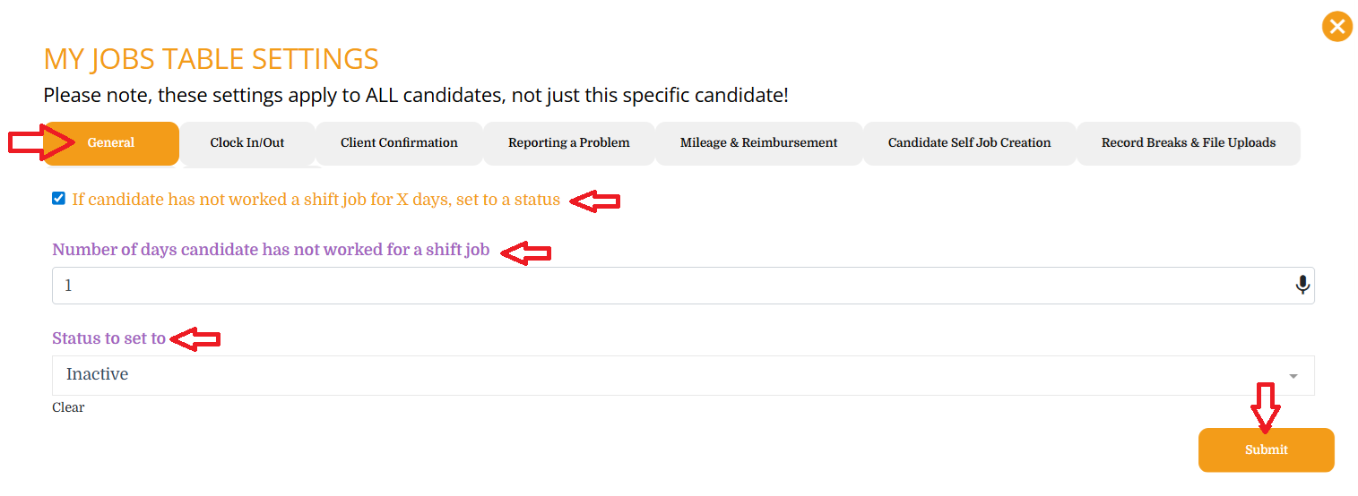 - Number of days candidate has not worked for a shift job - Enter required number of days after that needs to change status