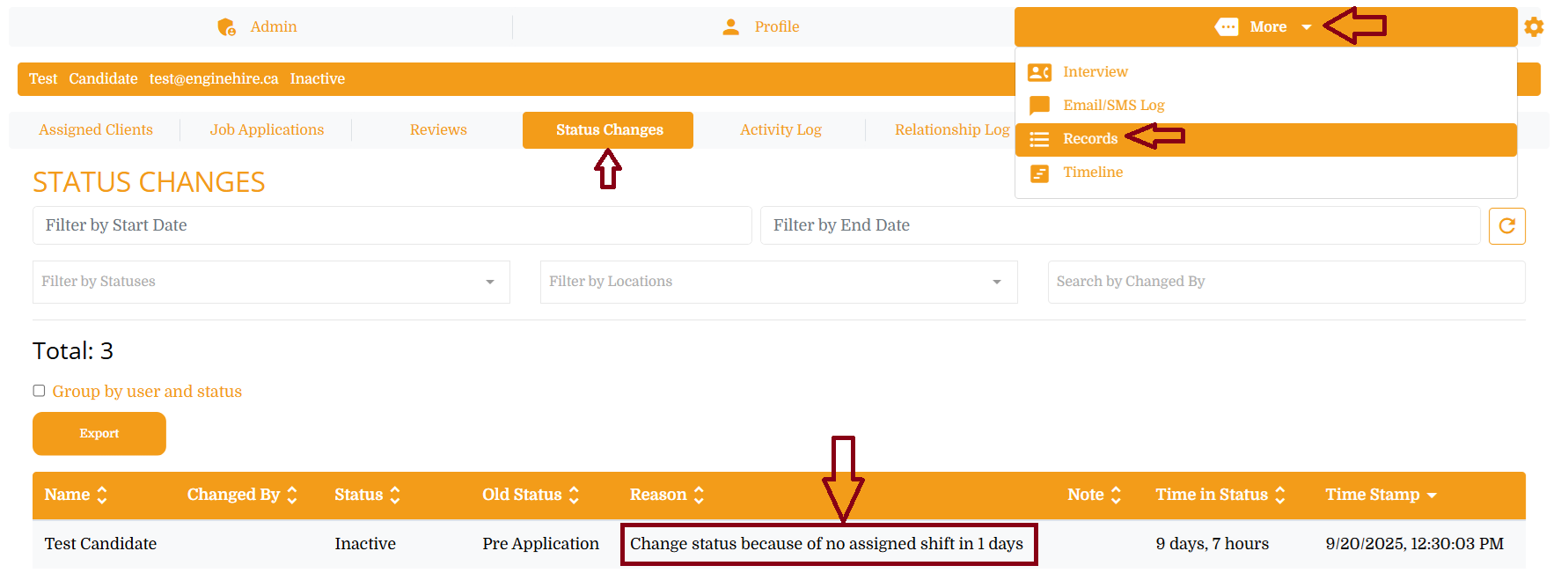 You can adjust the status of a candidate if they have not worked or taken a shift job in X amount of days