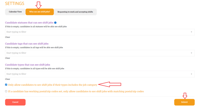 - Look for the setting "Only allow candidates to see shift jobs if their types includes the job category" and enable setting. Save the settings.