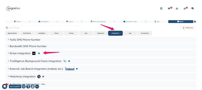 - Go to Integration and then click on Stripe Integration.